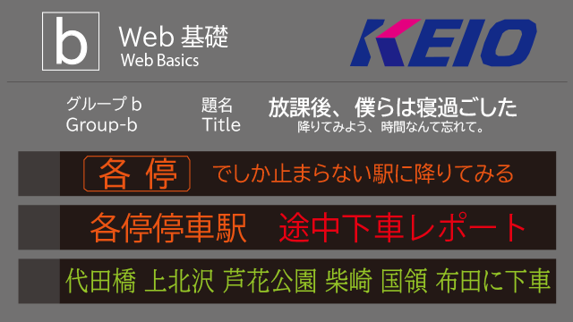 午後4時。心地よい京王線の揺れからふと目を覚ますとそこは各駅停車しか停まらない駅だった。仕方ない。巡り巡った運命(さだめ)を受け入れ降りることとしよう。さあ、どんな駅が僕らを待っているのか。行ってみよう。